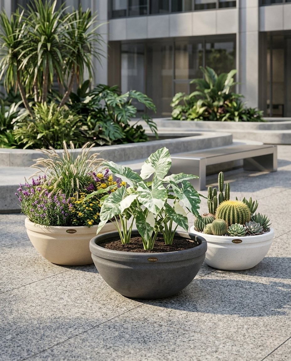 Our Bloom range of matt stone finished polymer pots are perfect for short heighted plants. Its round bowl design transforms it from just a planter to an artistic centre piece creating balance in any space.